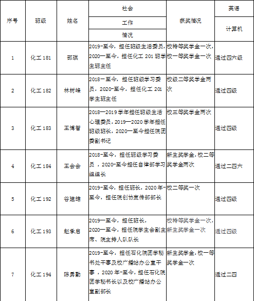 根據(jù)我校發(fā)展學生黨員公示制的有關(guān)規(guī)定,經(jīng)石油化工學院食品學院第學生黨支部討論決定和石油化工學院食品學院黨委審議,擬發(fā)展下列同志為中共預備黨員。現(xiàn)將基本情況公示如下: