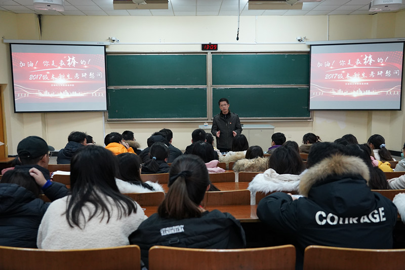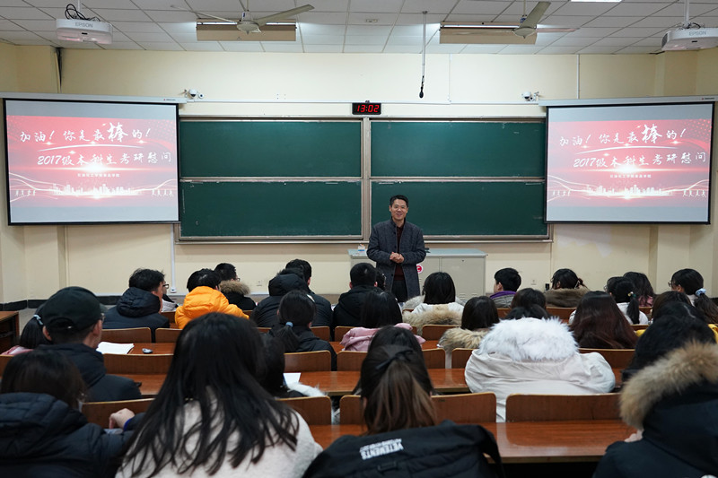 為堅(jiān)定學(xué)生的考研信念,增強(qiáng)考研自信心,積極面對(duì)考研,緩解考研壓力,12月8日,我院在W7召開了2017級(jí)本科生考研慰問會(huì),參加會(huì)議的有院黨委書記吳荷平、院長陳海群、副書記宣慧、副院長劉文杰、黃海、院關(guān)工委代表繆鳳仙、學(xué)院本科生輔導(dǎo)員以及2017級(jí)考研學(xué)子。