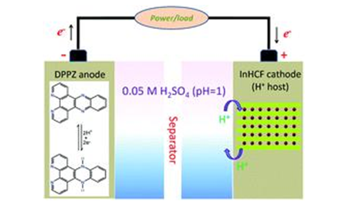 我院曹劍瑜-許娟團(tuán)隊最近在Chemical Communications上發(fā)表研究論文(DOI: 10.1039/d1cc01486b)。水系可充電電池通常以金屬離子為電荷載體。然而,金屬元素要么儲量有限,要么開采成本相對較高。在所有離子中質(zhì)子(氫離子)是最輕和最小的,在水溶液中具有最快的遷移速率,而且在地球上資源豐富。本論文設(shè)計了一種基于有機(jī)陽極和無機(jī)配合物陰極的水系可充電質(zhì)子電池。陽極二吡啶吩嗪中氧化還原活性吡嗪單元的可逆胺化和陰極銦普魯士藍(lán)中質(zhì)子的快速嵌入-脫嵌使該電池在1 Ag -1下可實現(xiàn)37 mAhg -1的可逆比容量,并展示了良好循環(huán)穩(wěn)定性和出色的倍率性能。此項研究得到了國家自然科學(xué)基金和江蘇省綠色催化重點實驗室科學(xué)基金的資助。