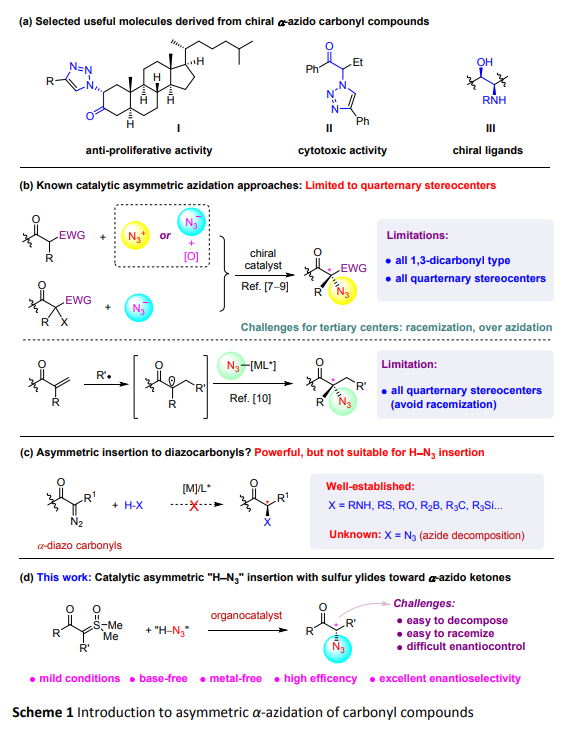 有機疊氮化合物在合成化學(xué)中是一類重要的合成砌塊,特別是結(jié)合了金屬催化的“click反應(yīng)”之后,其可被廣泛地應(yīng)用于化學(xué)生物學(xué)、材料科學(xué)、藥物研究等領(lǐng)域。其中的一類a-羰基疊氮化合物因其同時含有羰基及疊氮基等重要官能團,是合成含氮雜環(huán)及a-氨基酮(醇)的重要中間體;同時,研究發(fā)現(xiàn)其本身也具有一定的生物活性(Scheme 1a)。因此,該類化合物的合成,特別是通過不對稱催化方法來合成自然吸引了合成化學(xué)工作者極大的研究興趣。目前為止合成手性a-羰基疊氮化合物,文獻中已報道的方法學(xué)主要有(a)不對稱親電疊氮化;(b)氧化條件下的不對稱親核疊氮化;(c)不對稱親鹵親核取代反應(yīng)(SN2X);(d)不對稱自由基反應(yīng)等(Scheme 1b)。通過這些已報道的文獻,我們發(fā)現(xiàn)其構(gòu)建的手性產(chǎn)物主要局限為a-位雜季碳手性中心的羰基疊氮化物,目前為止尚未有通過不對稱疊氮化方法來直接構(gòu)建a-位雜叔碳手性中心的相關(guān)羰基疊氮衍生物的文獻報道。這種不足之處的主要問題在于(1)當(dāng)手性中心含有吸電子性質(zhì)的羰基與疊氮基時,手性中心的C-H鍵酸性變強,此時產(chǎn)物將對堿性反應(yīng)條件十分敏感,易通過烯醇互變異構(gòu)而消旋化或分解;(2)若利用文獻中報道的其他方法,比如,通過氧化條件下的不對稱親核疊氮化合成時,反應(yīng)的化學(xué)選擇性將難以控制,極易生成非手性的雙疊氮化副產(chǎn)物;(3)由于存在潛在的背景反應(yīng),反應(yīng)過程中的立體選擇性調(diào)控將更具挑戰(zhàn)。基于此,如何建立溫和的反應(yīng)條件是通過不對稱疊氮化合成a-位含雜叔碳手性中心的羰基疊氮衍生物的基礎(chǔ)與前提。