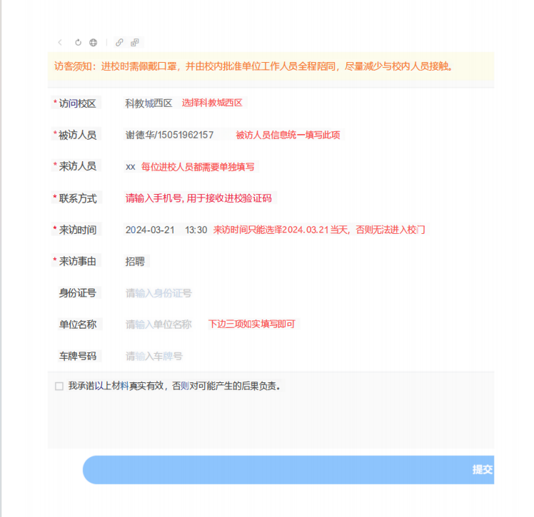 ③信息填寫完畢后點(diǎn)擊提交,審核通過后將收到預(yù)約信息登記成功短信并附帶入校鏈接,入校時(shí)請點(diǎn)擊鏈接生成入校二維碼并向門衛(wèi)出示即可。