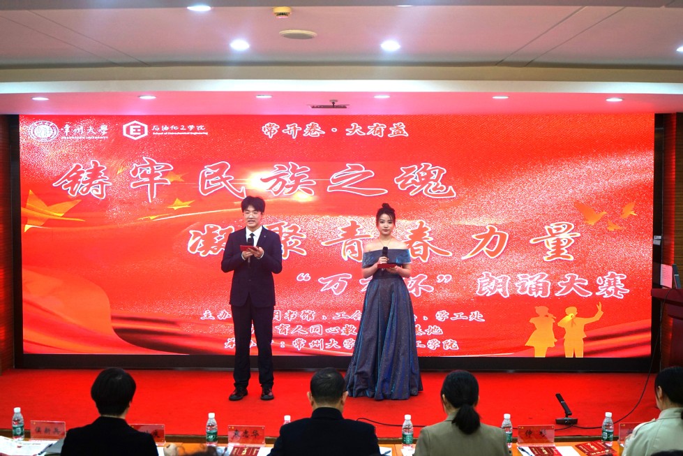 本次朗誦大賽是常州大學第十四屆讀書月系列活動之一,以“鑄牢民族之魂,凝聚青春力量”為主題,追尋輝煌的歷史歲月,展望未來璀璨的篇章。常州大學機械與軌道交通學院、智能制造產業(yè)學院黨委書記袁志華、石油工程與天然氣學院、能源學院黨委書記李曉明、周有光文學院黨總支書記焦?jié)崙c、華羅庚學院黨總支書記宣慧、圖書館館長侯新兵、團委副書記王國宇及工會辦公室主任劉樊出席本次大賽。