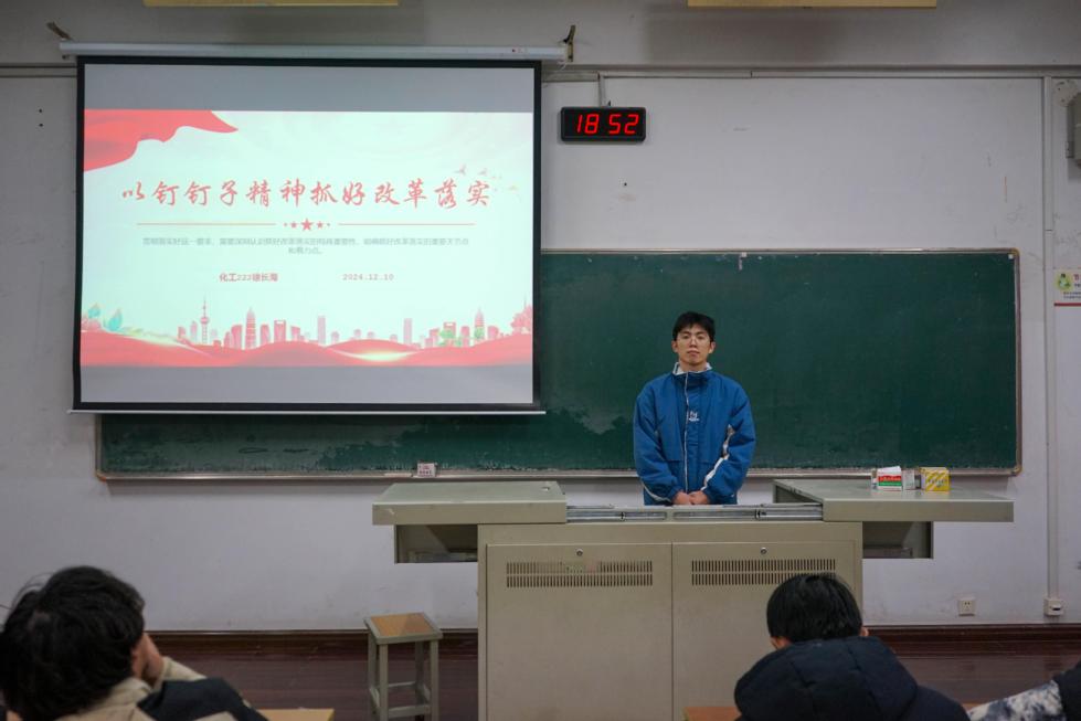 為積極響應(yīng)黨的二十屆三中全會(huì)的號(hào)召,以釘釘子精神全面推動(dòng)各項(xiàng)改革舉措的落實(shí),我院于12月10日在W1205教室開(kāi)展了“青年講師團(tuán)”系列講座第五講——以釘釘子精神抓好改革落實(shí)。本次講座由學(xué)生第一黨支部化工222徐長(zhǎng)海主講,我院學(xué)生代表參加。