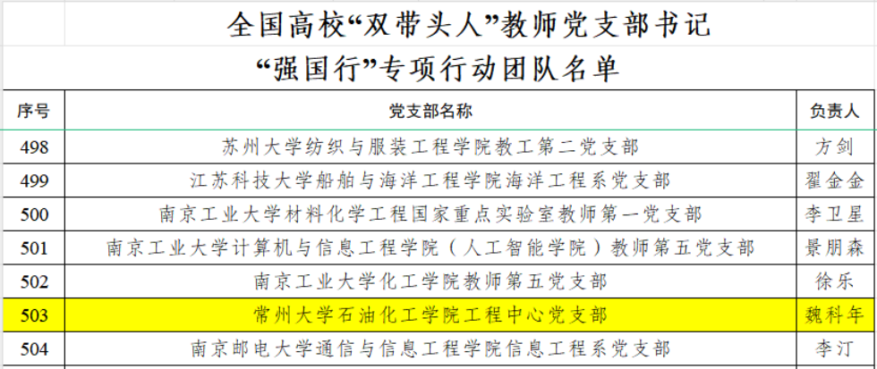近日,教育部辦公廳、省委教育工委分別公布了全國、全省高校“雙帶頭人”教師黨支部書記“強(qiáng)國行”專項(xiàng)行動(dòng)團(tuán)隊(duì)名單。我校石油化工學(xué)院工程中心黨支部成功入選全國高校“雙帶頭人”教師黨支部書記“強(qiáng)國行”專項(xiàng)行動(dòng)團(tuán)隊(duì)。