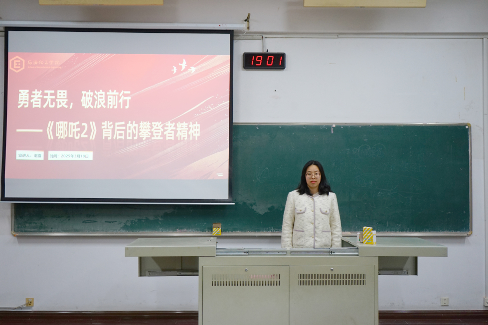 講座上,楊帆以《哪吒2》突破百億票房為切入角,指出《哪吒2》的大火啟示我們應(yīng)積極培養(yǎng)創(chuàng)新意識(shí),勇于實(shí)踐,將創(chuàng)新精神融入學(xué)習(xí)和生活的方方面面,為個(gè)人和社會(huì)創(chuàng)造更大的價(jià)值。接著謝露向同學(xué)們引出《哪吒2》背后的攀登者精神——刻苦鉆研、技術(shù)革新、團(tuán)隊(duì)精神以及文化傳承。她指出作為大學(xué)生要堅(jiān)守信念,培養(yǎng)鉆研探索的精神。