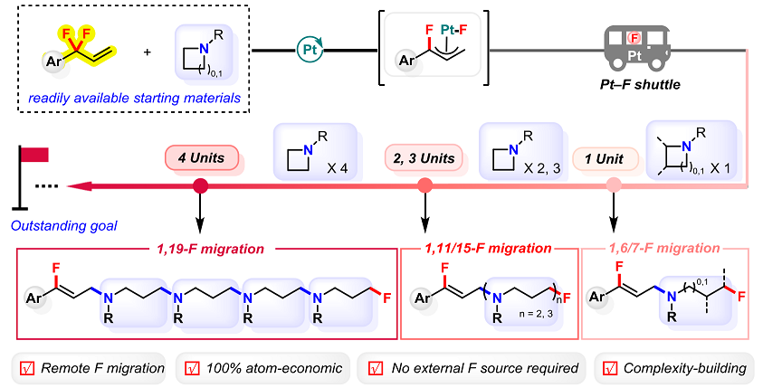 近期,常州大學(xué)陳銘教授團(tuán)隊(duì)發(fā)展了一種全新的鉑催化策略,利用簡(jiǎn)單易得的偕二氟亞甲基烯烴作為含氟前體,通過(guò)模塊化的多單元插入反應(yīng),首次實(shí)現(xiàn)了超遠(yuǎn)程氟遷移,成功構(gòu)建出一系列1,6-、1,7-、1,11-、1,15-乃至1,19-二氟化合物。這項(xiàng)研究將氟原子的遷移距離前所未有地拓展至19個(gè)化學(xué)鍵,開(kāi)辟了C–F鍵重構(gòu)與空間編輯的新路徑。
