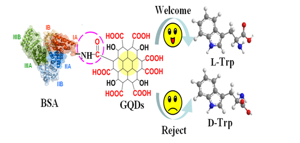 Covalent Functionalization of Bovine Serum Albumin with Graphene Quantum Dots for Stereospecific Molecular RecognitionQiumin Ye, Lili Guo, Datong Wu, Baozhu Yang, Yongxin Tao, Linhong Deng, Yong Kong* 原文鏈接:https://pubs.acs.org/doi/10.1021/acs.analchem.9b02605 牛血清白蛋白(BSA)是一種研究廣泛的血清蛋白,因其具有易溶、成本低、生物相容性高等優(yōu)點已引起研究者的廣泛關(guān)注。近日,課題組制備了BSA 與石墨烯量子點(GQDs)的復(fù)合材料,并將其成功應(yīng)用于色氨酸(Trp)對映體的電化學(xué)識別。GQDs與BSA之間的酰胺化反應(yīng)形成的酰胺鍵破壞了BSA原有的規(guī)整形貌,改變了BSA整體肽鏈的空間構(gòu)型,使BSA分子原本的三維心形結(jié)構(gòu)得以擴(kuò)展,從而使肽鏈上的手性中心更易于暴露,提高了BSA-GQDs復(fù)合物的識別效率。